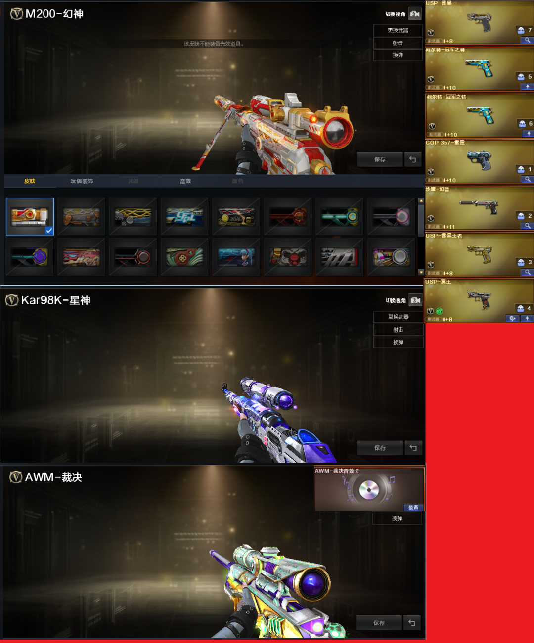 装备描述:排位:可以、、、、、、、、、、、爆破四防:幻神(24AG冠军皮肤)、98K星神、、、、USP雷暴、USP冥王、USP雷暴王者、COP雷霆、2个冠军之特、幻兽沙鹰、、、、、FAMAS G2-天戎、白虎、QBZ金色蔷薇、、、裁决音效、白虎音效、毁灭音效、黑骑士音效、、、1套幻兽、6套雷霆、1套堕天神、1套玄豹、1套雷暴王者、、、爆破四防(王者春、王者魅影、职业经理)